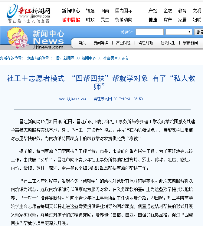 晋江新闻网10月31日讯 近日,晋江市向阳青少年社工事务所与泉州理工学院商学院团总支共建学雷锋志愿服务实践基地,建立“社工+志愿者”模式,并先行在内坑镇试点,开展帮就学日常结对志愿帮扶服务,为内坑镇特困家庭...
