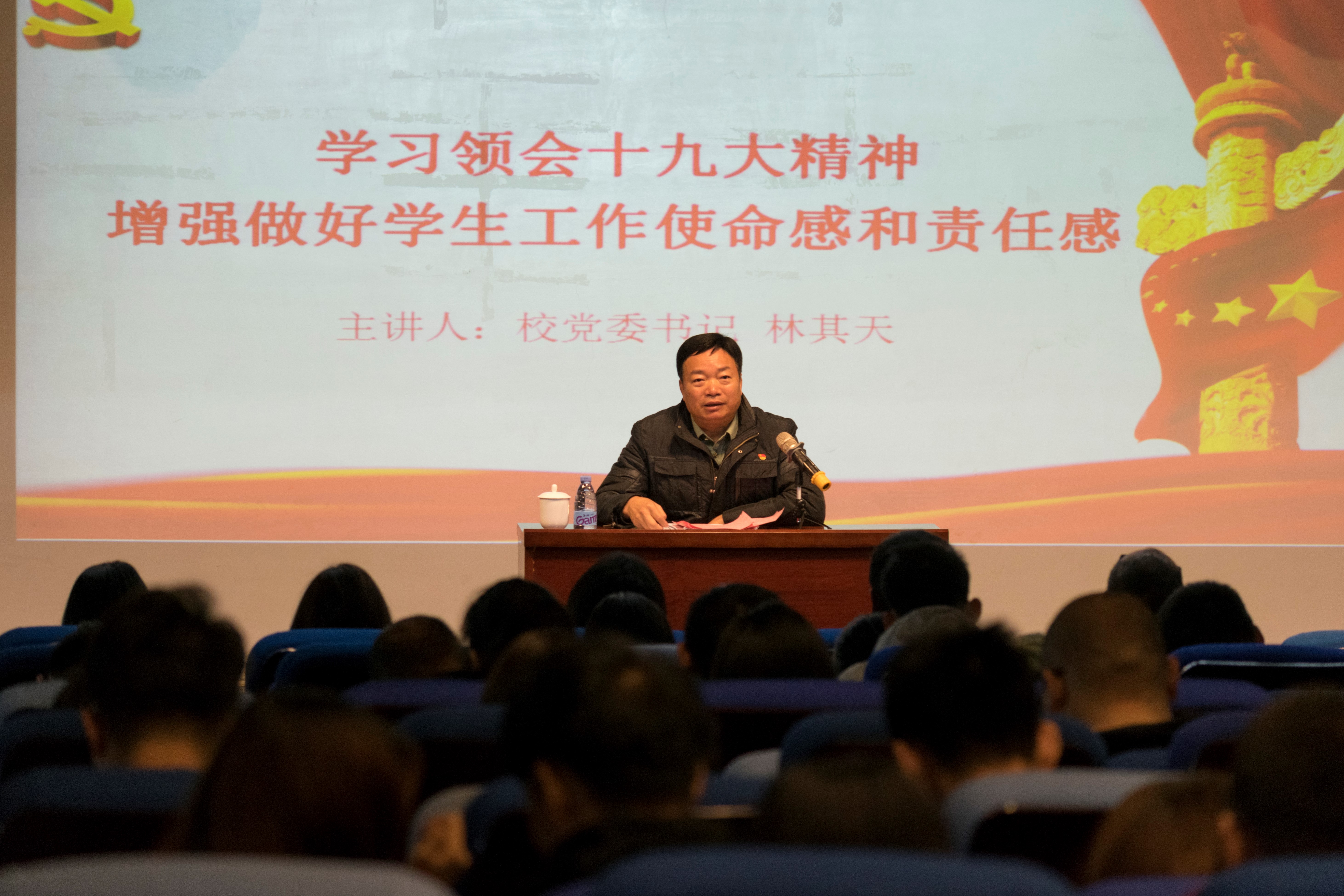 为全面领会贯彻党的十九大精神,同时进一步增强我校学工队伍的使命感和责任感。2018年1月4日下午,在我校633会议室,学工处组织开展了“学习领会十九大精神,增强做好学生工作使命感和责任感”的专题讲座。参加本次会...