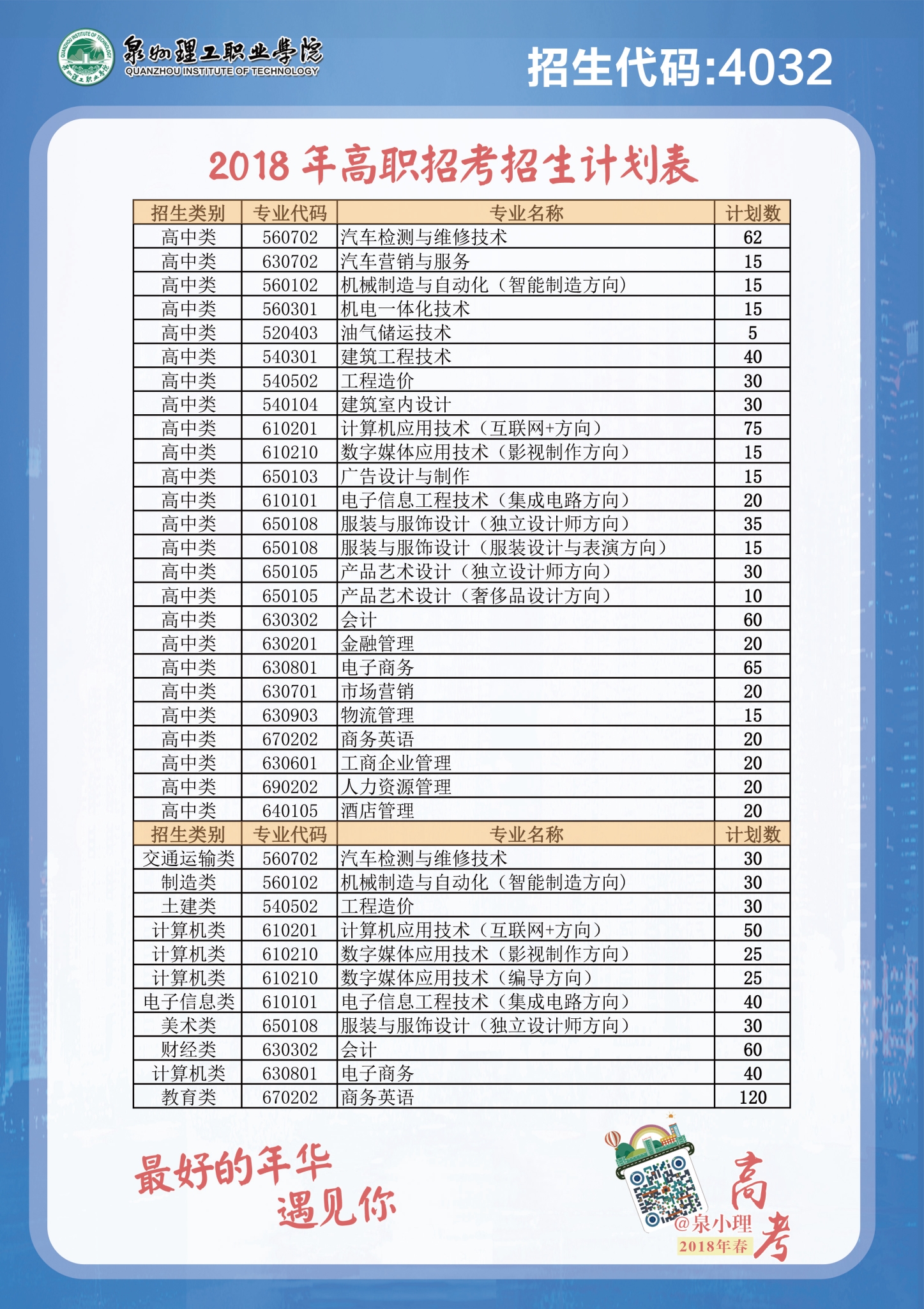 泉州理工职业学院2018年高职招考招生面向高中类招生687人,面向中职类招生480人。 其中,中职招生科类有计算机类、土建类、制造类、交通运输类、美术类、财经类、教育类、电子信息类。具体招生专业及计划如下: ...
