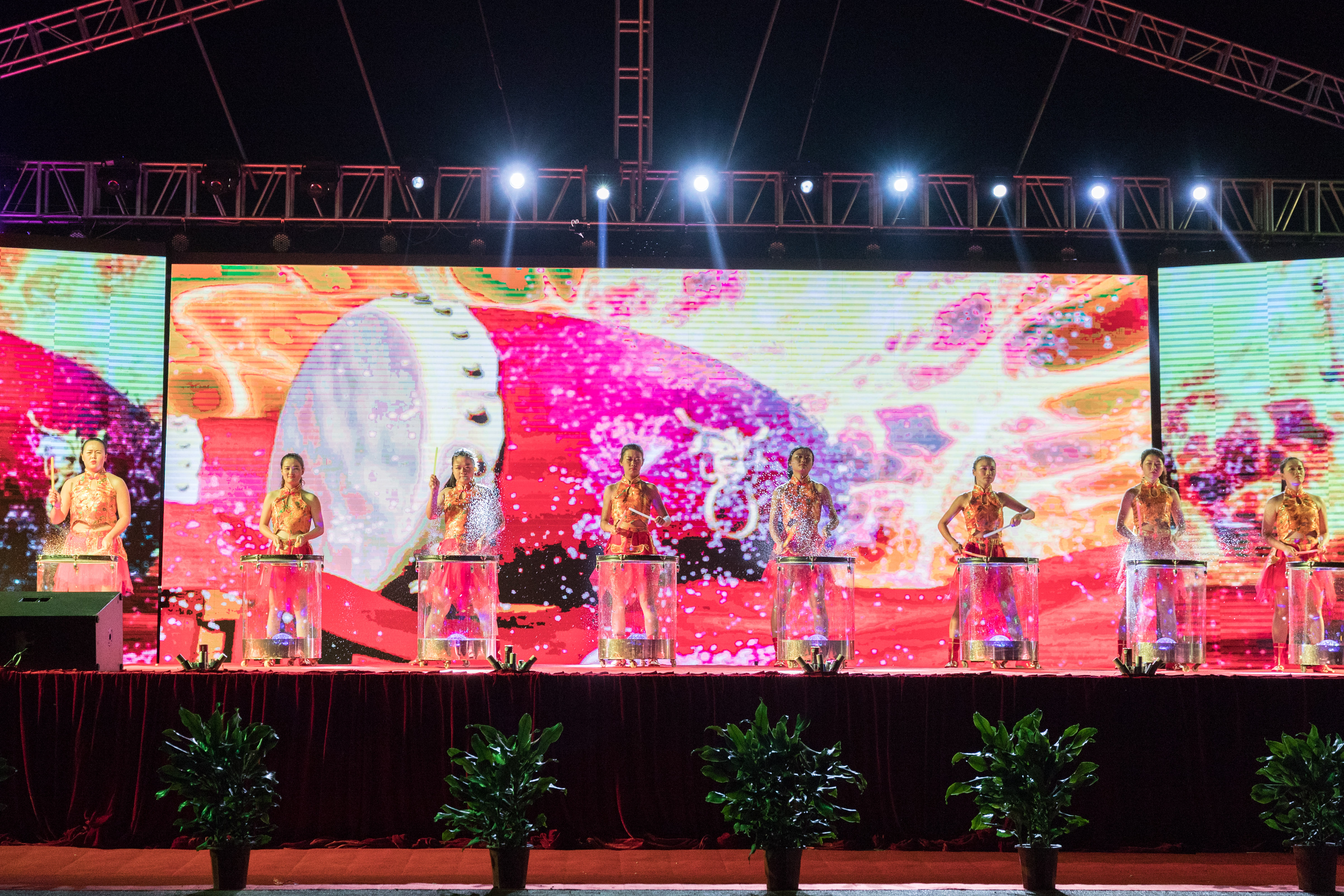 铿锵有力的水鼓舞《中国龙》拉开晚会的序幕