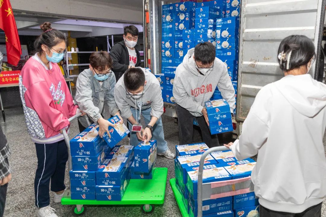 接收、分类、装箱,再一件件抬上电瓶车运到各个书院分发……3月21日,校领导、教职工、教工家属纷纷加入抗疫教职工志愿服务队中,共出动近百人次,为全校学生提供送餐服务,全力保障学生们的用餐。