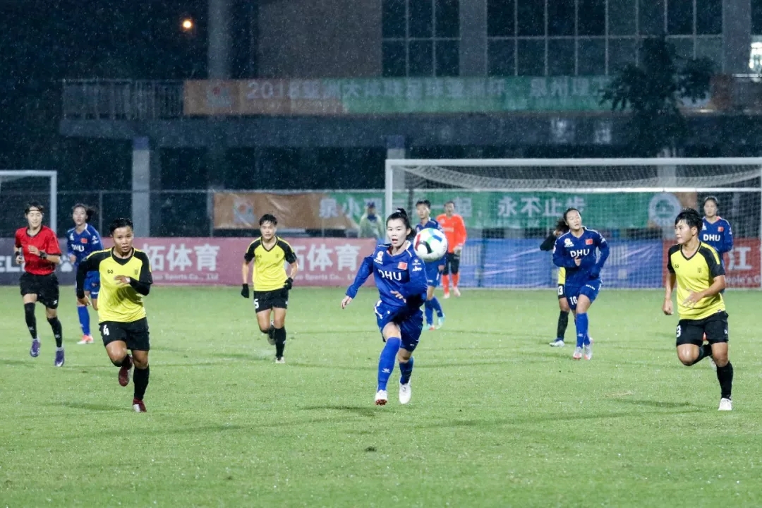 第5分钟,东华大学队16号球员尤丹丹带球走中路,在弧顶附近起脚远射,皮球打在对方球门横梁下沿后入网。东华大学队1:0,暂时领先。