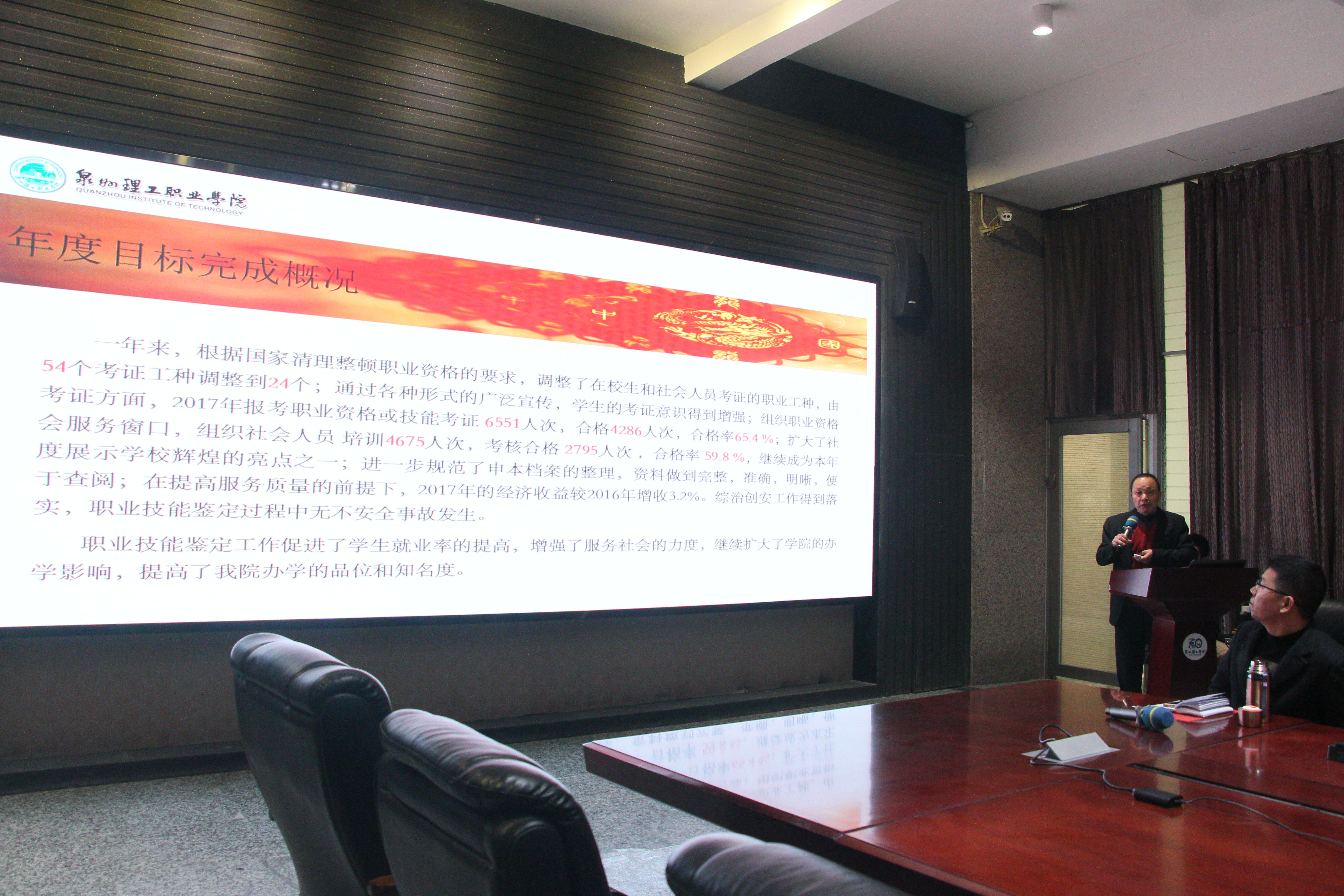 1月24日-25日,各行政部门进行述职。教务处2017年度工作要点拟定70项,执行过程中增加25项工作,经梳理共完成92项,完成率为131%。教务处注重规范化建设,组织学习并落实各类制度,推行程序化管理,服务专业建设、教学、教师业务发展。教务处对2018年初拟8大项95小项工作,并对督导工作重点部署。科研处项目协同创新、产教融合的项目持续推进;申报新增专利申请18项,获得授权专利24项,同比增长200%;公开发表论文增长41.3%;2017年组织科协举办科普活动8场同比增长166%。2018年工作重点继续优化增量,调整存量。