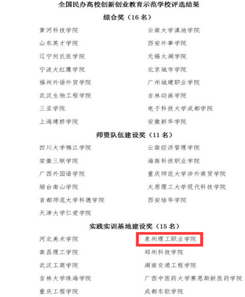据悉,为贯彻落实《国务院办公厅关于深化高等学校创新创业教育改革的实施意见》(国办发〔2015〕36号),进一步深化民办高校创新创业教育改革,培养应用技术型人才,提升民办高等教育人才培养质量,中国民办教育协会高等教育专业委员会在全国组织开展了“全国民办高校创新创业教育示范学校”评选表彰活动。经过学校申报、省民办教育协会和中民协高专委工作部推荐等程序,再由全国民办高校创新创业教育示范学校评选专家组评审、投票,并经评选领导小组审定,评选产生全国民办高校创新创业教育示范学校。在此次评选活动中,泉州理工学院能获此殊荣,是对我校创新创业工作的肯定和鞭策,也将更大程度地推进我校创新创业教育的发展。