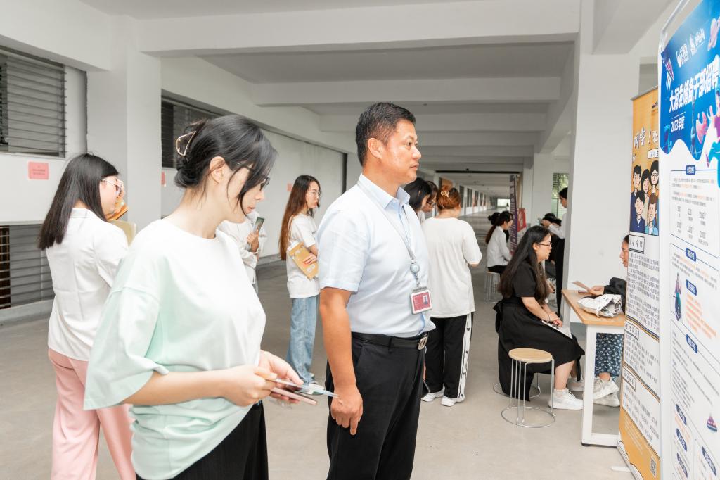 副校长张建军带领商学院、教务处、学生工作处等人员到场了解企业招聘及学生应聘情况,为现场参加应聘的学生提供应聘指导。