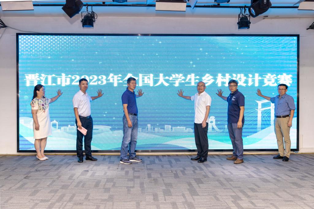 紧接着,骆伙明、洪元程、王也夫、王量量、吴滨如、蔡尚才共同在大屏幕按下手印,正式启动晋江市2023年全国大学生乡村设计竞赛。