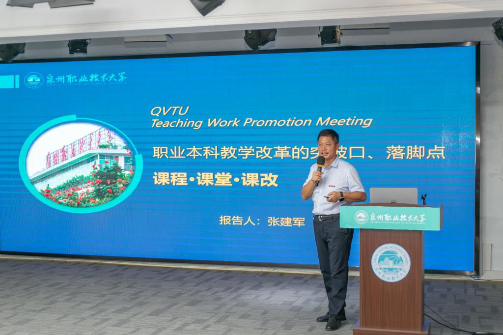 张建军作《职业本科教学改革的突破口与落脚点:课程、课堂、课改》的讲话,他强调高质量推进职业本科教育试点改革,课程是教学改革的突破口,课堂是教学改革的落脚点。他提出要构建多级递进的课程建设体系,多元共建的课堂教学体系,多方参与的质量评价体系。他要求老师要转变理念,做教学改革的落实者;建好资源,做课程升级的建设者;学会方法,做课堂创新的先行者。