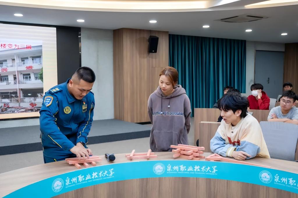 讲座由泉州市防震减灾科学传播师杜晓航主讲。他结合自己参与救援的生动案例,从地震的成因、危害、避险等方面进行深入讲解,全面普及防震减灾常识。邀请师生代表上台进行模拟演练,与会师生们积极互动,现场气氛热烈。