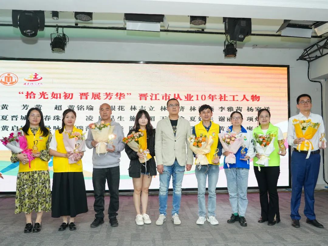 ▲ 周先进、傅一鸣、施世强分别为在晋江市从业10年的社工人物颁发纪念奖杯