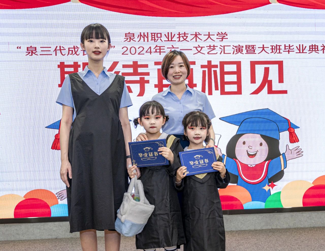 5月30日,泉三代成长营2024年六一文艺汇演暨大班毕业典礼举行。这场活动不仅是为了庆祝六一国际儿童节,这还是成长营大班小朋友们人生中第一个毕业典礼。活动中,孩子们化身小小歌唱家、舞蹈家、画家,用他们清脆的歌声、优雅的舞步和绚丽的画笔,献上一场充满“闽南味”的文艺表演。出席活动的有我校工会主席陈其生、副主席朱冰梅,教育学院院长张君,泉三代成长营负责人欧阳默涵,以及成长营小朋友与家长。