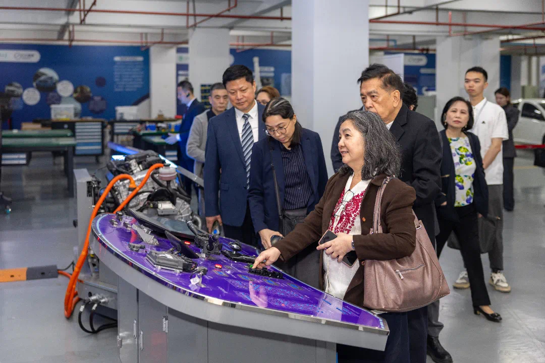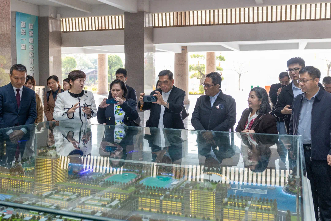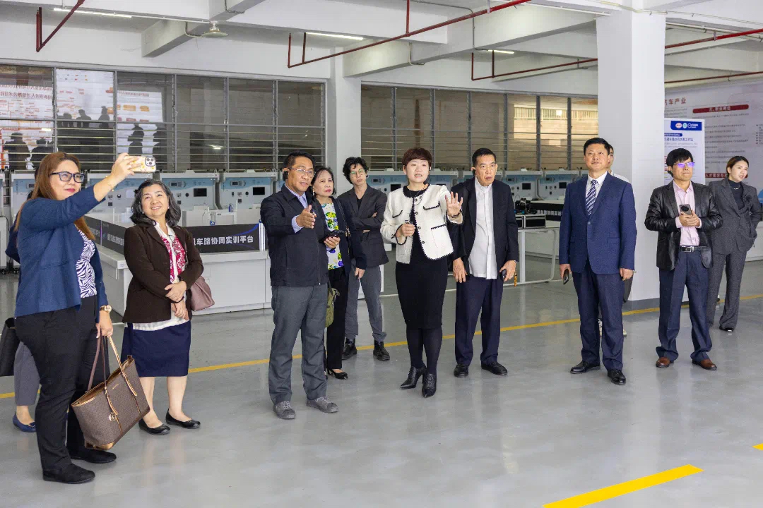 正式会议前,埃尔·西德·卡斯蒂略一行现场考察我校校园建设、新能源汽车产业学院、福建省乡村振兴直播产业基地、艺术设计展厅、数智人才培养基地等,详细了解我校职业本科人才培养、产教融合、职教出海方面的创新做法和成效。考察团一行对以学校为代表的中国职业教育发展现状惊叹不已,希望加快推进在菲落地产业学院、师资培训基地、技能竞赛基地等,助力菲律宾在地技能人才培养和产业繁荣。