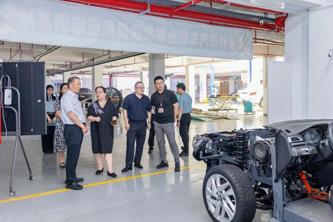 吴立春一行先后参观了我校生态校园沙盘、校史馆、艺术设计展厅、电商直播基地、数智产教融合展厅及行云新能源产业学院等教学科研场所。每到一处,校领导充分围绕学校发展沿革、校企协同机制、专业群建设成果、数智培养及产业实践等方面作系统介绍。途中,吴立春与我校创办人/董事长吴金营亲切交流,对吴金营董事长质朴务实、躬耕职教的精神深表钦佩。