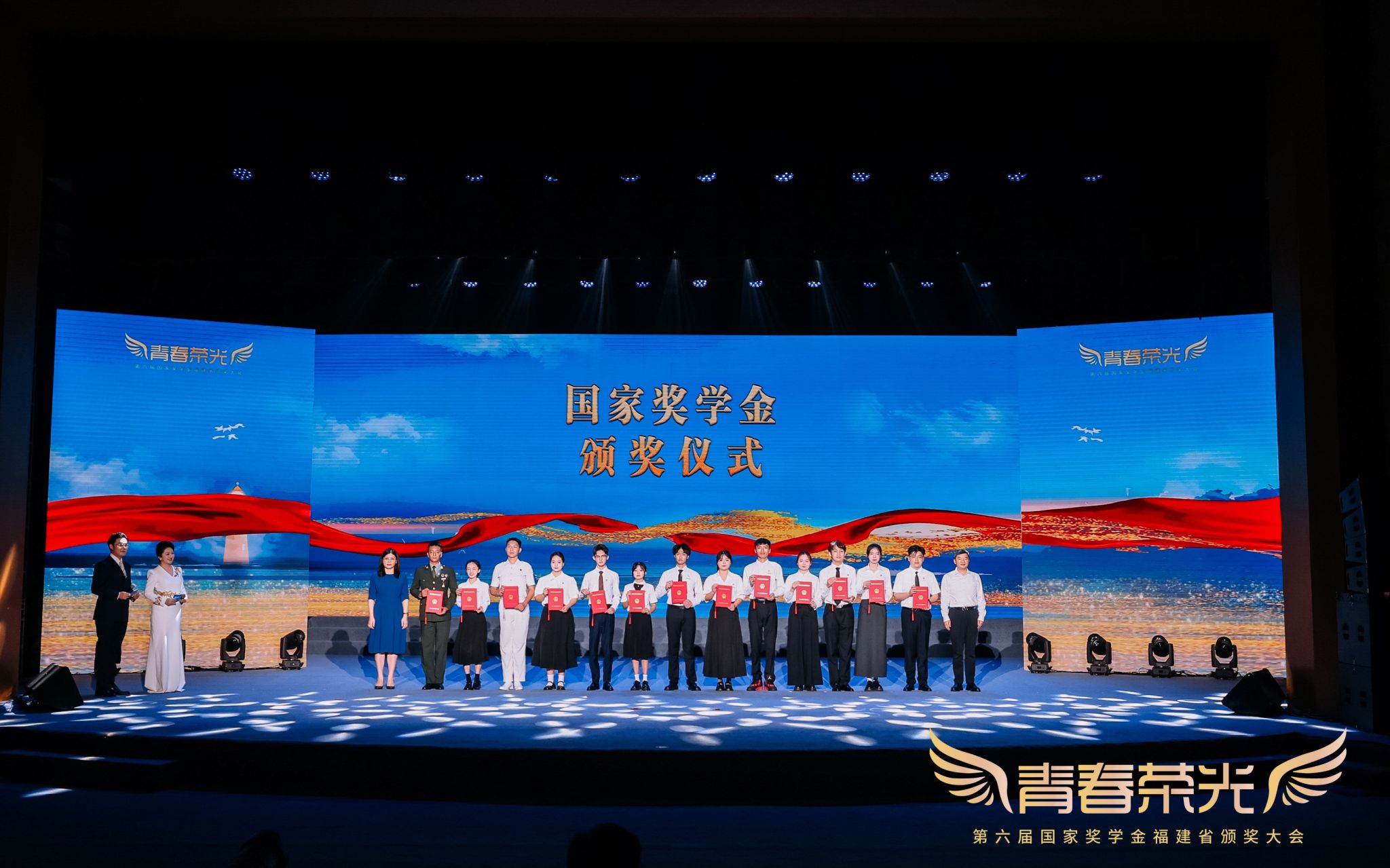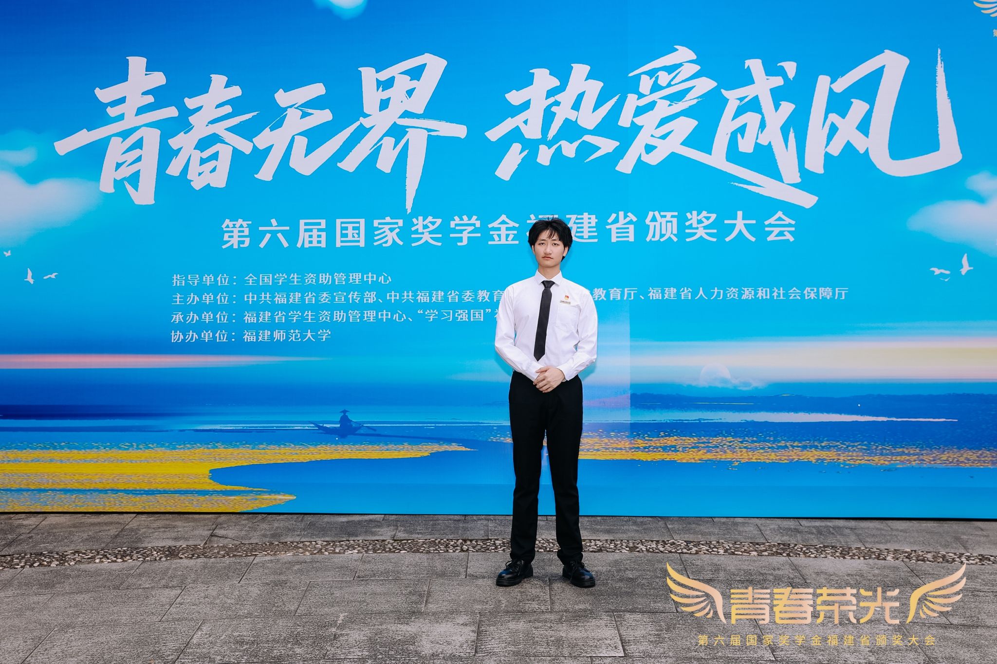 本届颁奖大会以“青春无界 热爱成风”为主题,通过“追风”“乘风”“御风”三大篇章,为来自省内高校、中职学校的2024年国家奖学金、国家励志奖学金获奖学生代表颁奖。我校党委副书记/副校长蔡金佩应邀出席,学生资助管理中心黄婷婷带队参加本次颁奖大会,2021级软件工程技术专业白伟锋作为国家奖学金获奖学生代表上台领奖。
