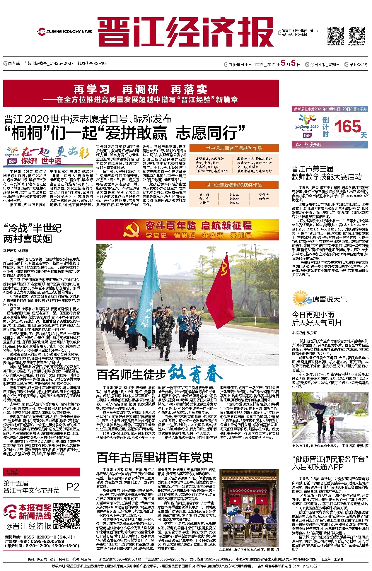 “我们希望通过这样的活动,引导青年大学生走出宿舍、走下网络、亲近自然,同时锻炼年轻人的毅力和耐力,用实际行动弘扬五四精神,传承红色基因,为建党100周年献礼。”泉州职业技术大学团委办公室主任曾子石介绍,学校自建校以来,每天都组织早锻炼,增强学生体魄。此次他们更是将这一传统与党史学习教育相结合,让学生有了沉浸式的学习体验。