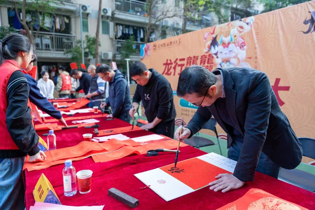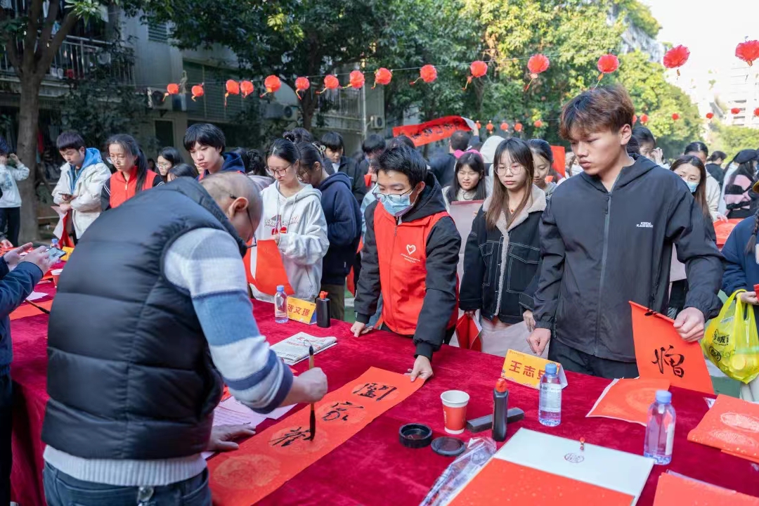 为进一步提升资助育人成效,弘扬中华优秀传统文化,新春佳节来临之际,泉州职业技术大学举行“龙行龘龘 墨香泉大”送春联活动。邀请中国书法家协会、福建省书法家协会的几位书法家和学校师生们一同书写、现场赠送,为泉大师生献上了吉祥喜庆的春联。他们命笔挥毫,一撇一捺之间,将新春祝福深深地融在了一张张联纸上,整个校园瞬间溢满了浓浓的墨香。