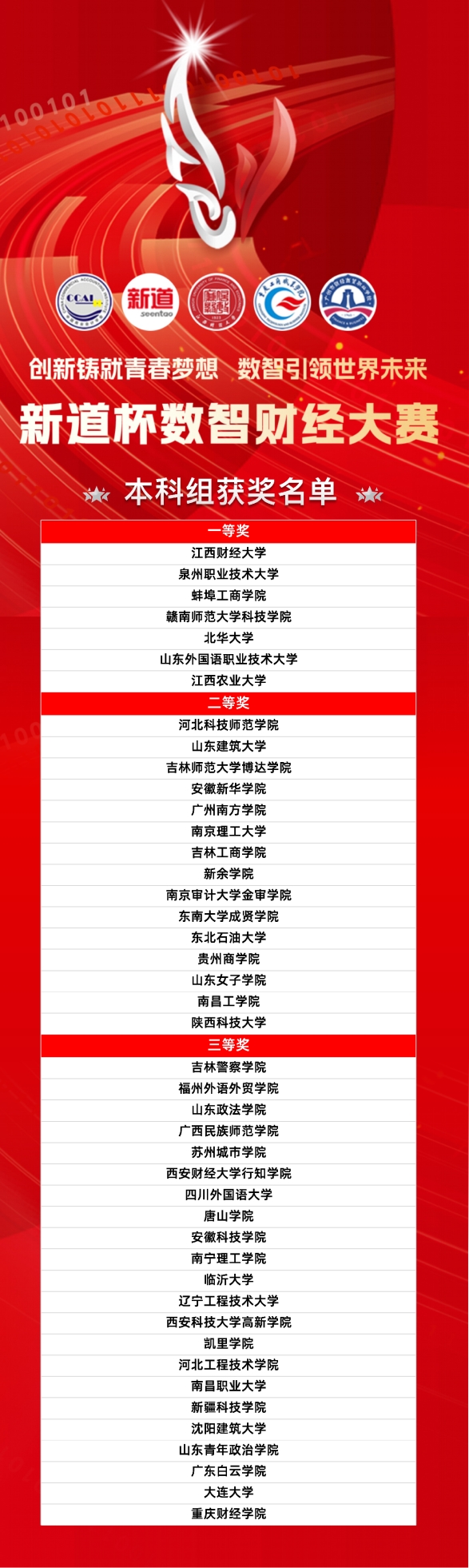 12月1日,2024“新道杯”数智财经大赛总决赛成功落幕。本届大赛由中国商业会计学会、新道科技股份有限公司主办,江西财经大学(本科组)、重庆工商职业学院(高职组)、广州市财经商贸职业学校(中职组、中职教师组)承办。来自全国各地的74支本科参赛队伍、71支高职参赛队伍经过两天激烈比拼,江西财经大学、泉州职业技术大学、蚌埠工商学院、赣南师范大学科技学院、北华大学、山东外国语职业技术大学、江西农业大学荣获大赛本科组一等奖,江西财经职业学院、江西飞行学院、安徽商贸职业技术学院、东营科技职业学院、福建林业职业技术学院、浙江金融职业学院、江苏财会职业学院荣获大赛高职组一等奖。