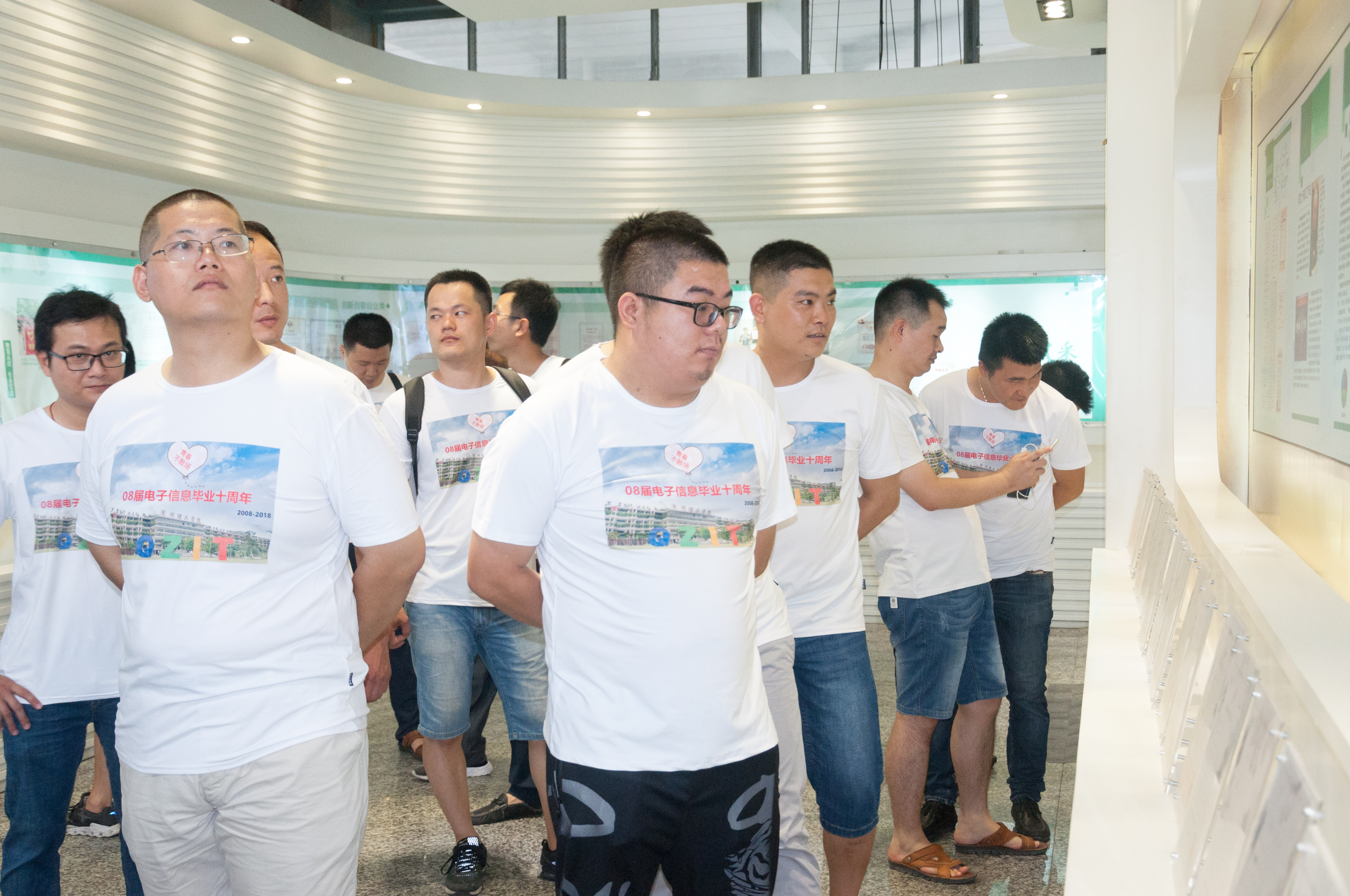 校友们穿着特制的纪念T恤,一同游览新校区,回忆校园点点滴滴。在参观校史馆后,看到学校取得的一项项傲人的成绩后,许多校友都不“淡定”了。“学校的变化真的太大了,环境更好,成绩更是喜人。”电子信息工程技术专业的傅东海高兴地说。在看到“永不止步”展区时,校友们纷纷驻足,一同回忆起曾经晨跑的日子。会计3班的陈珏激动地说:“看着这个展区,好多回忆都涌上来了,早锻炼真的是一生都无法忘怀的时光。”