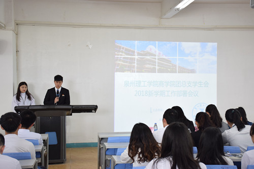 3月16日中午,泉州理工学院商学院团总支学生会在238会议室召开了2018新学期工作部署会议。此次会议是商学院学生会新学期首次大会,商学院团总支书记罗永珍老师、商学院学生会指导老师方媛媛老师、商学院学生会指导老师张明娟老师与商学院学生会的全体成员。