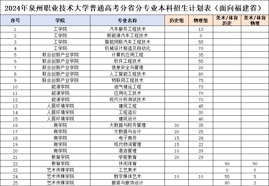 2024年泉州职业技术大学普通高考分省分专业本科招生计划表(面向外省)
